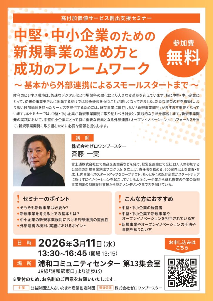 ※2025年2月に満員御礼となり大変好評いただいたセミナーについて「外部連携」に関するテーマを拡充し、パワーアップしてお届けするとともに、さいたま市産業創造財団の本年度支援策に関するご紹介を予定しております。
